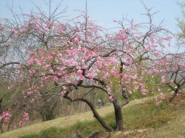 垂枝桃是桃花中枝姿最具韻味的一個類型,其小枝拱形下垂,樹冠猶如傘蓋。花開時(shí)節(jié),宛如花簾一瀉而下,蔚為壯觀。無論是孤植于庭院,還是群植,都有很好的觀賞效果,可作為公園、小區(qū)等地的景觀樹或行道樹